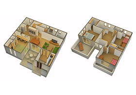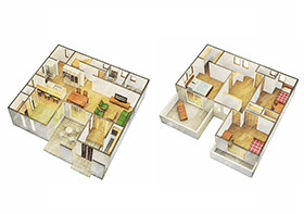 3Dマンションの間取図は、家具あり、家具なし、水彩タイプを制作します。1DKなど、小さめの間取の価格は5,000円から制作します。お問い合わせください。