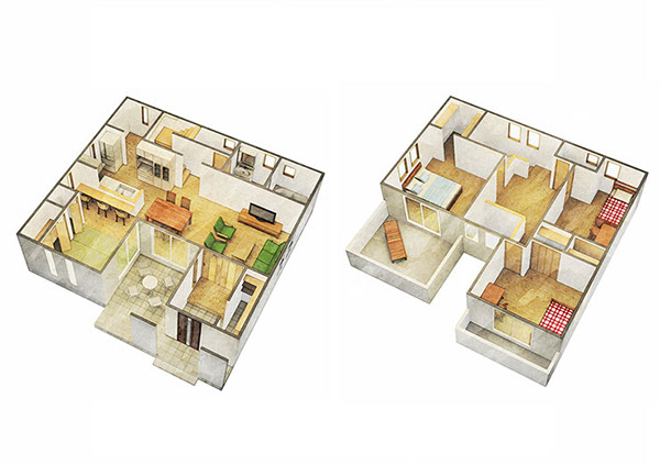 家具なし、家具ありパースを水彩風に加工します